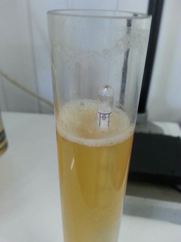 Die Hefe im Faß unter Druck hat sich bis auf 8,4% Brix heruntergeknabbert. Das entspricht einem scheinbaren Restextrakt von 5,2° Plato (6,7° Plato tatsächlich).