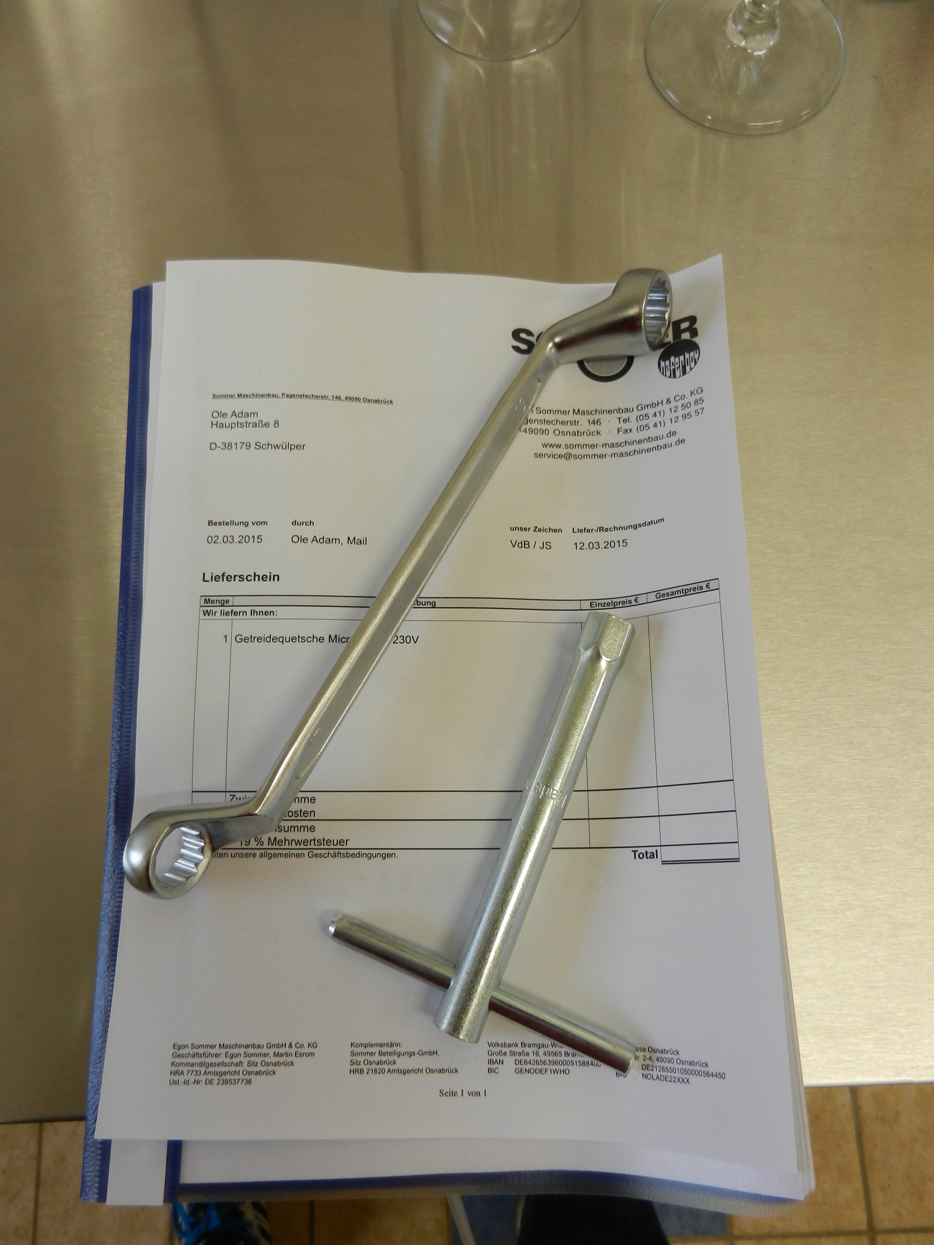 Es wurde also ein Haferboy Typ „Getreidequetsche Micro 075 S 230V“ bestellt. Nach der Auftragsbestätigung der Firma Sommer wurde ein Termin mit der Spedition vereinbart. Mit der Spedition wurde dann der Liefertag und Uhrzeit terminiert. Henry war so freundlich und hat das Gerät dann angenommen und die Palette im Sudhaud Schwülper verstaut.