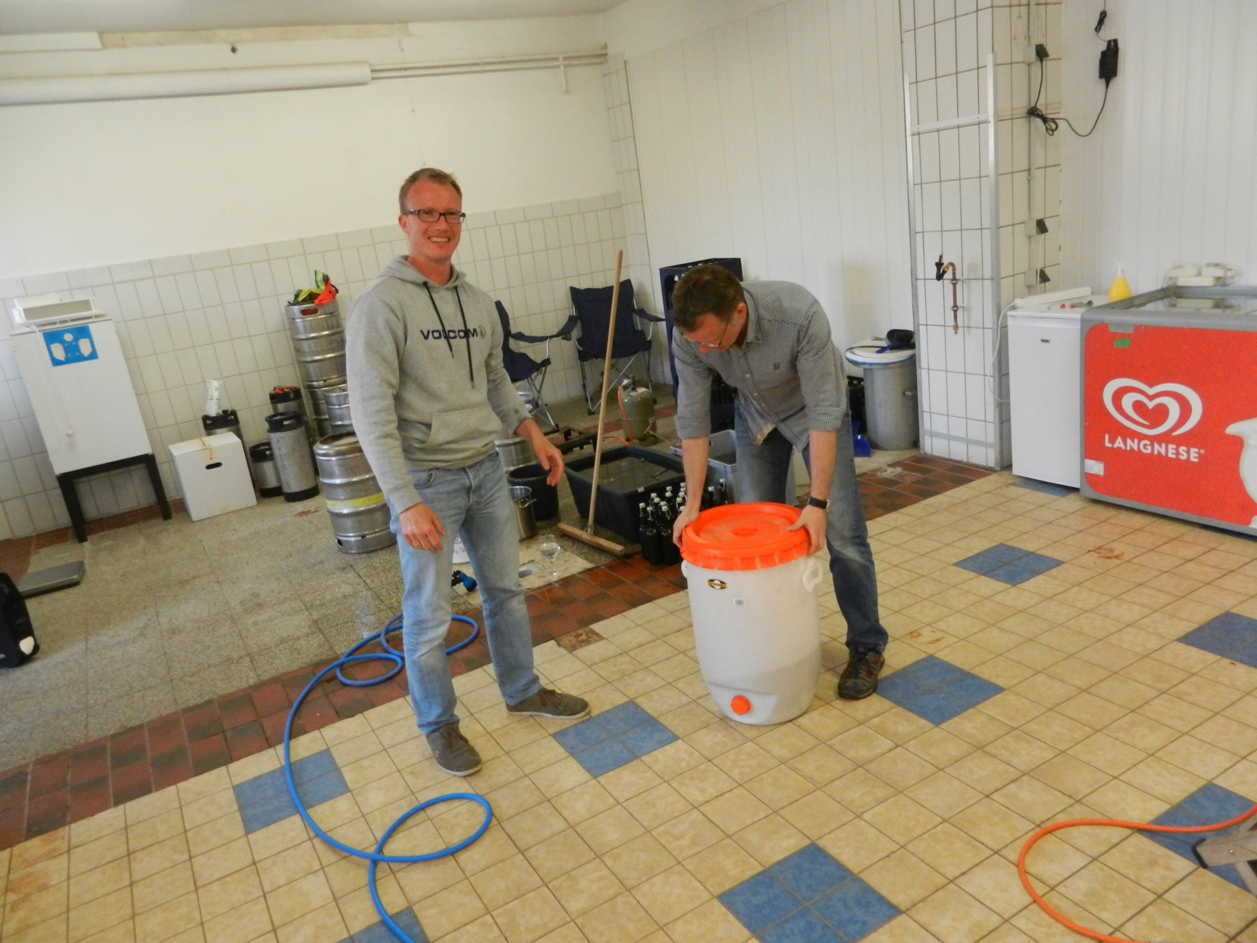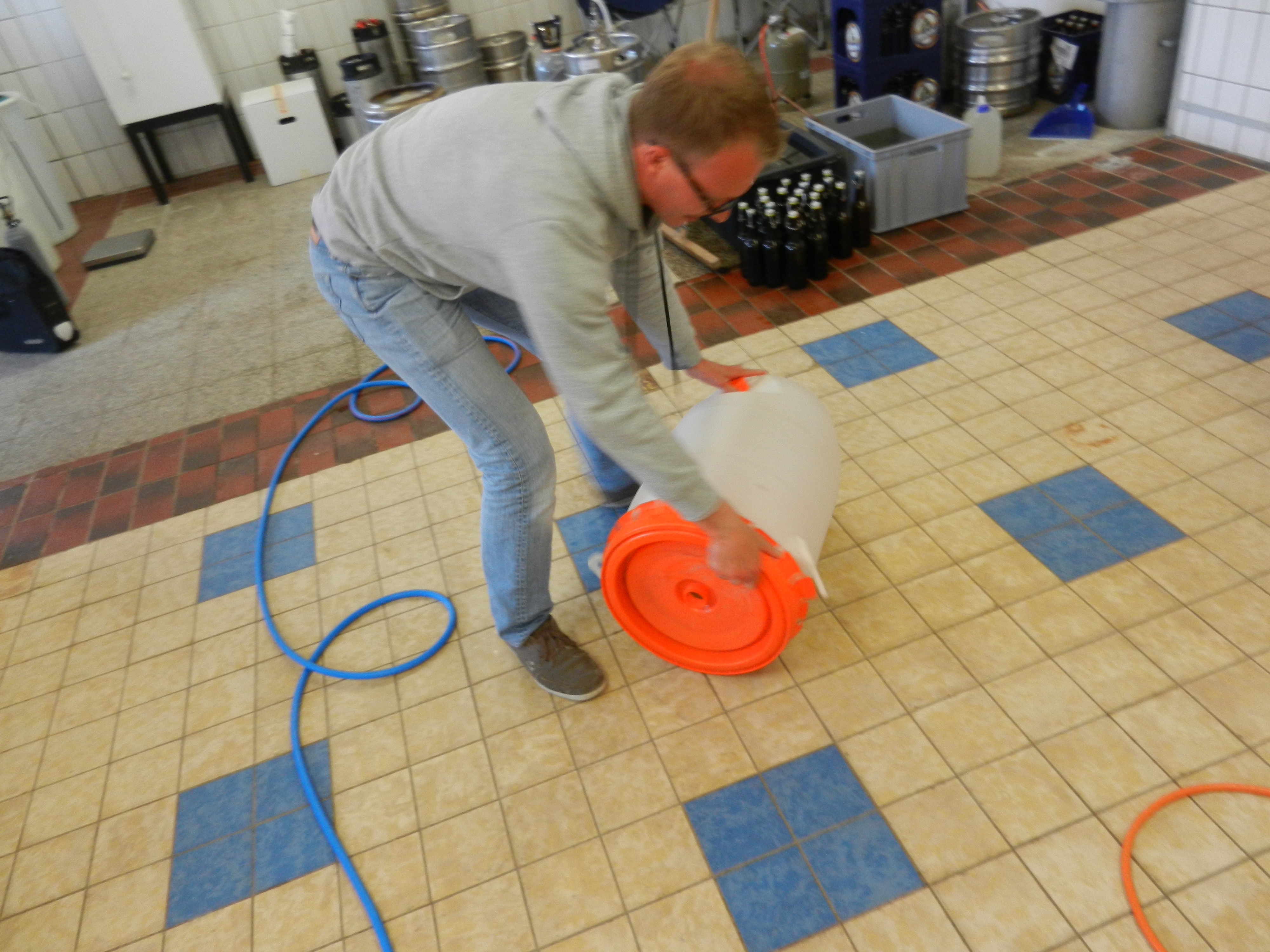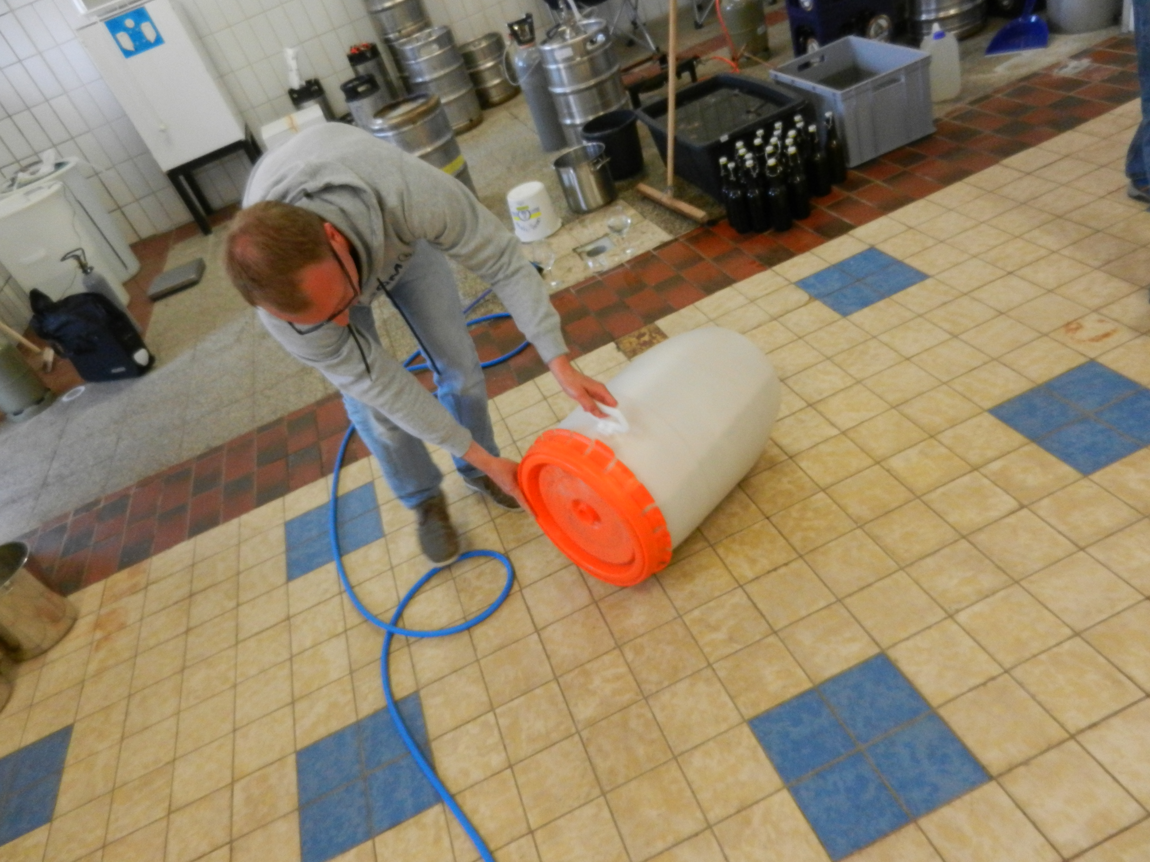 Carsten, der sich als Hobbybrauer in Braunschweig zu erkennen gegeben hat und als Besuch angemeldet hatte, prüft gerade den festen Sitz des Deckels auf dem Gärfass.
