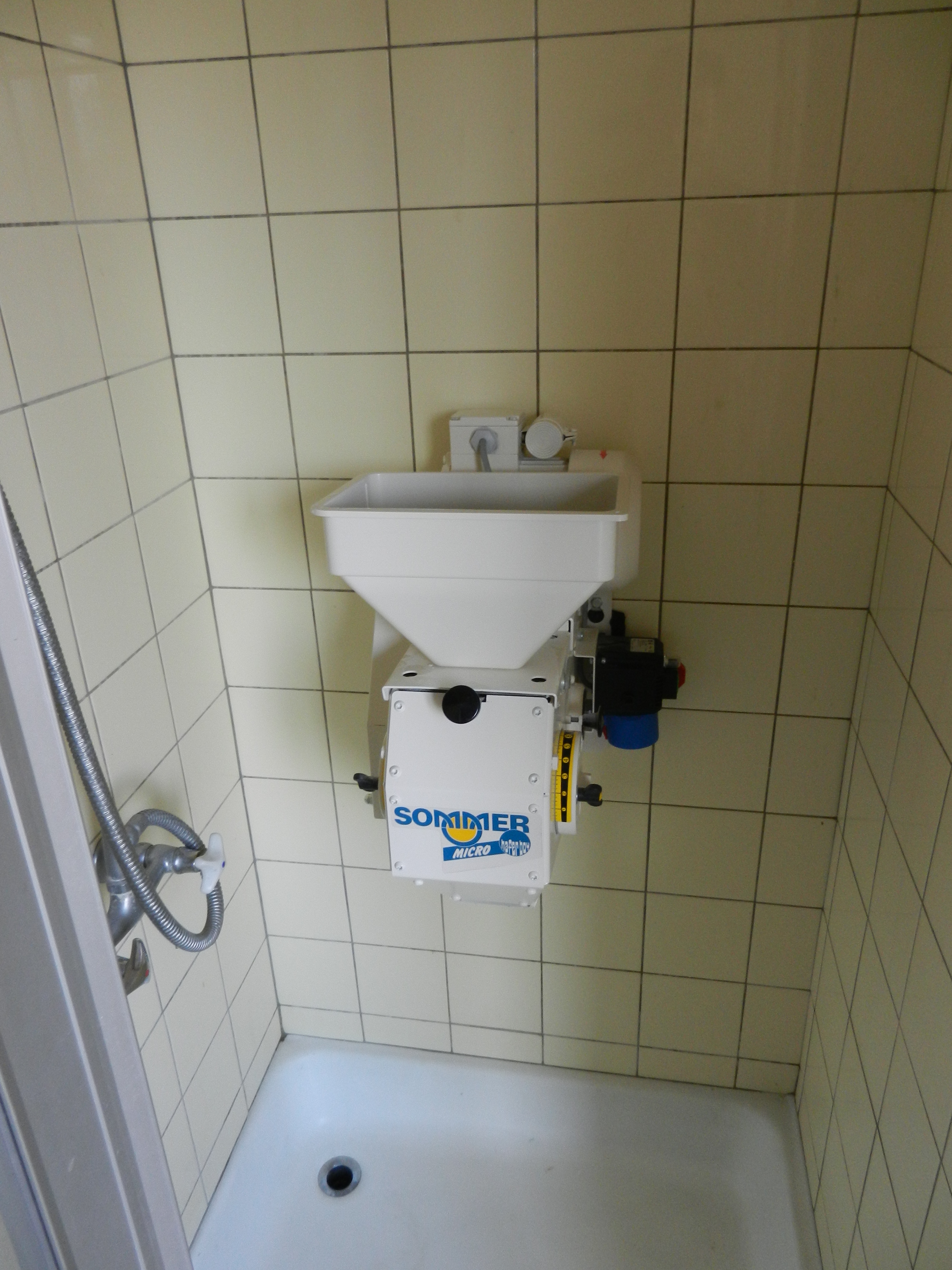 Den nächsten Tag war ich dann im Baumarkt um Befestigungsmaterial zu besorgen. Da das Schroten doch schon sehr viel Staub verursacht wurde der Haferboy kurzerhand in der Dusche installiert. Nach dem Schroten kann man dann einfach einmal durchspülen.